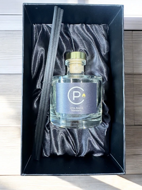 Lime, Basil & Mandarin Reed Diffuser. This vibrant fragrance blends the zesty freshness of lime, the herbal elegance of basil, and the sweet, sun-ripened warmth of mandarin to create a sophisticated and uplifting scent.